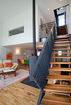 Die bestehenden Bauten, entlang der Pestalozzistrasse, prägen mit ihren viel- fältigen Gebäuden und Dachformen, den einladenden Vorgärten und den gross- zügigen Familiengärten das Bild des Quartiers. Die für das Quartier typischen und raumbildenden Abschlüsse mit Mauern und Hecken wurden übernommen. Das Bauvolumen übernimmt die Fluchten der angrenzenden Häuser. Im westlichen Teil des Baukörpers liegt eine über drei Stockwerke verteilte Wohnung mit Galerie. Der östliche Teil enthält je eine grosszügig gestaltete Wohnung im Erd- und Obergeschoss. Die Wohnung im Obergeschoss besitzt nebst dem Balkon einen eigenen, zum Teil überdachten und windgeschützten Dachgarten.